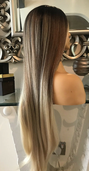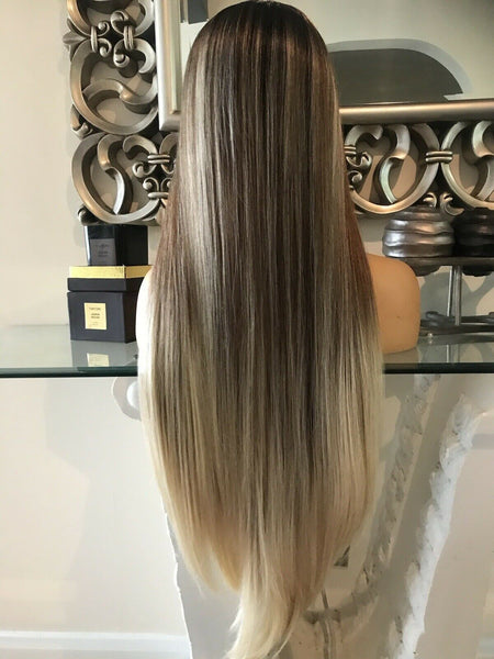 Extremely striking wig SO beautiful face framing blonde with chestnut and a beautiful brown finish tones to form a stunning ombré finish
